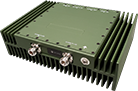 A dual bi-directional amplifier assembly that was designed for the RF-7800W HCLOS radio. It features two independent MIMO Tx/Rx sections that operate from 4400-6000 MHz at a peak power of 10W. A highly linear RF lineup allows for low SNR transmission of waveforms of up to 256QAM modulation. Designed for outdoor applications, it has passed many MIL-STD-810G tests, including the following test methods: 514.6 Vibration, 505.5 Solar Radiation, 506.5 Blowing Rain, and many others. It is also qualified to several MIL-STD-461E test methods for EMI/EMC. It is also coated with CARC paint. Request a quote today! | |